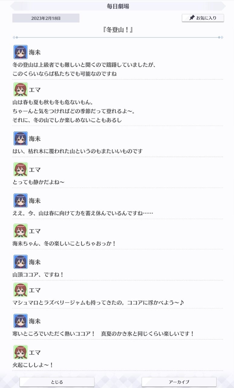 【海未とエマ、冬登山で山頂ココア【毎日劇場】】の続きを読む
